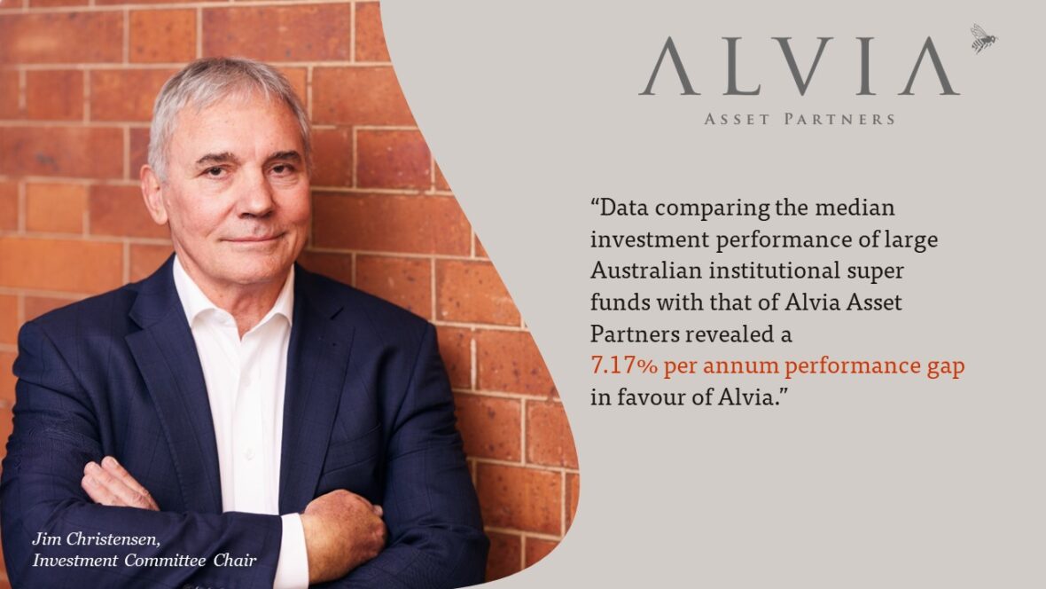 Data comparing the median investment performance of large Australian institutional super funds with that of Alvia Asset Partners revealed a 7.17% per annum performance gap in favour of Alvia.